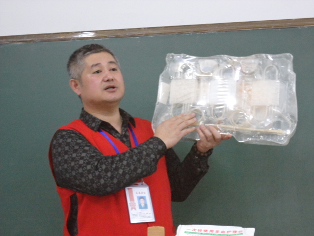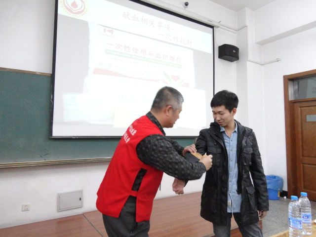 会前组织部部长杨明超同学带领大家进行了无偿献血志愿者宣誓。随后正式进入培训主题,本次培训会的主讲人是哈尔滨无偿献血志愿工作者服务组织的负责人王晓明先生,他为现场的同学们讲解了哈尔滨血站的运作情况以及无偿献血的常识,更就同学们所关心的如何进行志愿者服务进行了详尽的说明。其间,王晓明先生以血站的专业医疗用品与在场同学进行了互动,进一步加深了大家对于血站工作的了解。