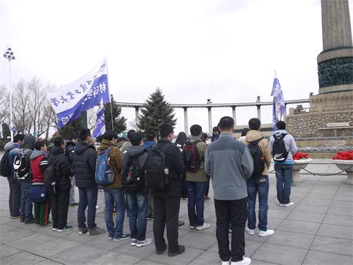 十点三十分,祭扫完毕。为了重温英烈精神,徒步活动开始。每位同学手持塑料袋,捡垃圾、除广告,一边徒步一边美化沿途公共设施。这次徒步活动的起点是防洪纪念塔,终点是音乐长廊,途经斯大林公园,九站公园,公路大桥和音乐广场,全程7.5公里。路程不远,但恶劣的气候打磨着每个同学的意志。出发时飘着片片雪花,紧接着便是狂风大作,但随后又变成了晴天。始料不及的天气变化使原本以为会轻松的徒步变得艰难起来,这考验的不仅是大家的体力,更是在考验大家的毅力,大家都是在咬牙坚持,没有一个同学因为寒冷或体力不支而掉队。经过两个小时的艰难跋涉,十二点半,终于到达了终点音乐长廊。
