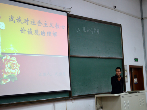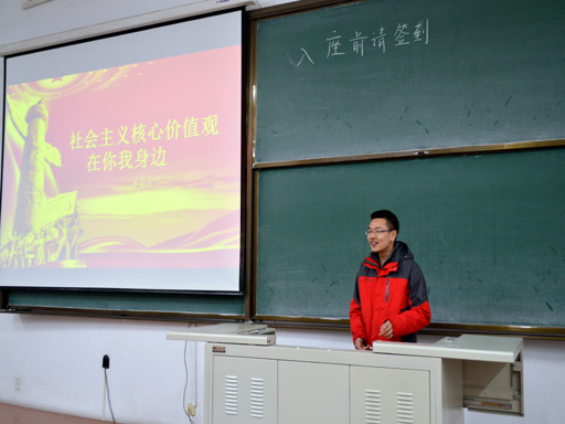 首先是13硕李泓江同学进行了《社会主义核心价值观在你我身边》的报告,他从身边的小事上做切入点引出了论点,社会主义核心价值观就在我们的身边,并详细的介绍了大学生如何做弘扬社会主义核心价值观的践行者。代想想同学则以《浅谈对社会主义核心价值观的理解》为题,讲述了自己对于社会主义核心价值观的形成过程、主要内容、重大意义和如何践行方面的理解。陈晓宇同学则在核心价值观的内涵上进行了深刻的解读,同时阐明了构建社会主义核心价值观的重要意义。张夏明同学则主要解读了如何在复杂的国际形势下践行社会主义核心价值观,以及弘扬社会主义价值观对实现中华民族的伟大复兴的重要性。