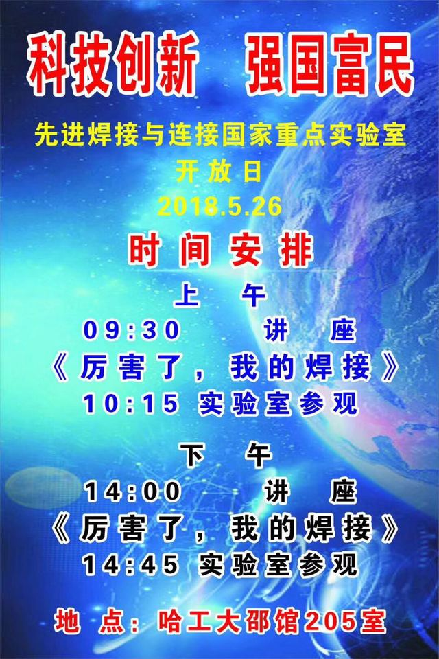 为响应国家科技部关于国家重点实验室开展公众开放活动的号召,提高公众科学素养,发挥学术团体的社会职能,哈尔滨工业大学先进焊接与连接国家重点实验室将于5月26日开展全市范围内的“实验室开放日”活动,构建科技工作者与青少年交流平台,提高青少年科技创新意识和科技实践能力,激发青少年对未知世界探究的兴趣。