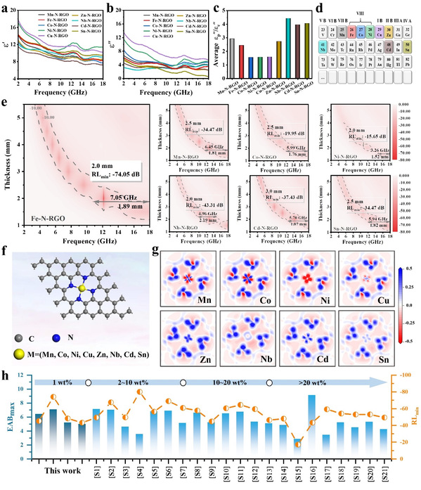 针对这一难题,研究团队发现合理地设计异质原子掺杂是打开石墨烯带隙的重要手段,利用N原子配位辅助策略,在原子尺度上将一系列单金属原子M -N₄(M = Mn、Fe、Co、Ni、Cu、Zn、Nb、Cd和Sn)嵌入石墨烯中,显著调节了石墨烯的电导和介电频散特性。结合实验和第一性原理计算分析,原子的轨道杂化和电荷转移,使得掺杂位点可作为极化中心,实现偶极极化、界面极化、缺陷诱导极化和电导损耗机制的协同衰减。在填充量仅为1 wt%时,其反射损耗值达到-74.05 dB,最大有效吸收带宽实现7.05 GHz。该研究工作不仅为深入探究石墨烯的介电损耗机理提供了重要依据,同时也为新型高性能碳基吸波材料的开发提供新的策略。