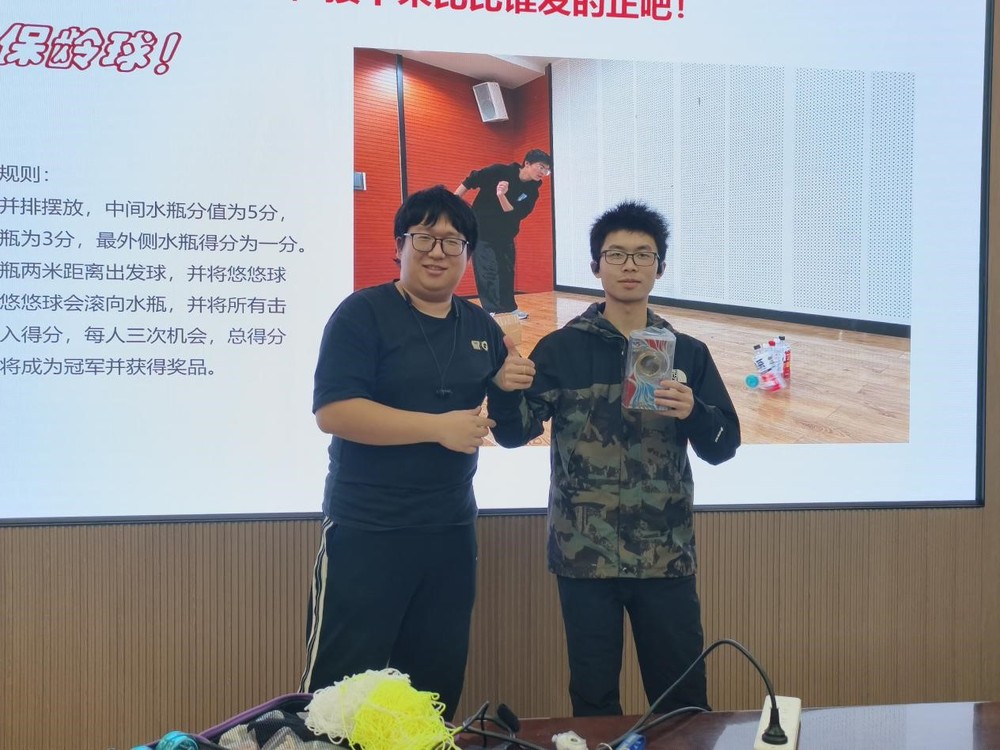此次活动分为社团介绍、悠悠球介绍与学生体验三部分。社团负责人曹家铭介绍了社团的基本情况,讲解了社团的活动安排与未来学年的计划,并现场展示讲解了悠悠球花式的分类、结构等。在体验环节,同学们领取悠悠球,在社长和社团骨干的分组教学、耐心教导下学习动作要领。最后同学们在“悠悠保龄球”互动游戏中结束活动,并合影留念。