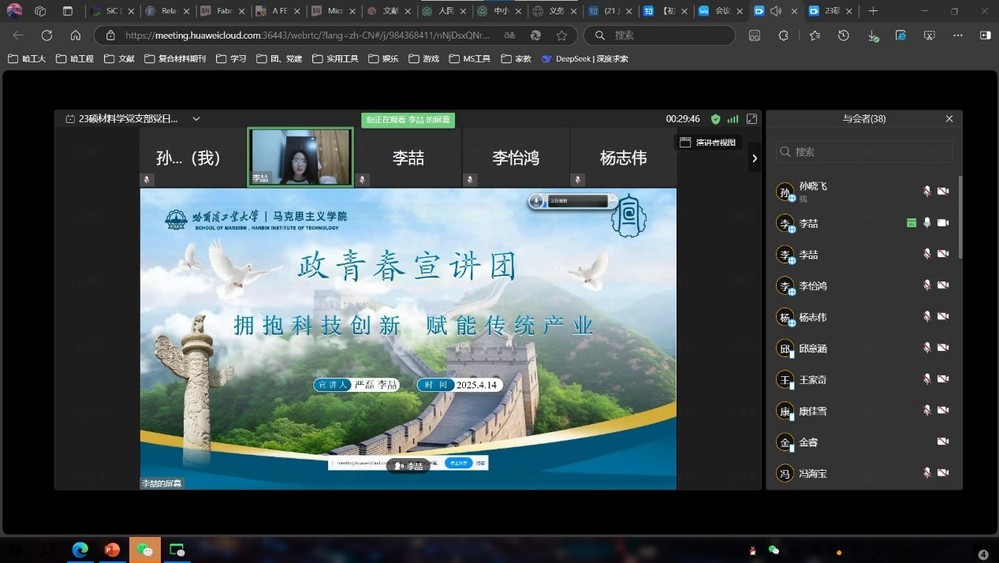 为深入学习贯彻2025年全国两会精神,加强党员思想政治教育,4月14日,博彩app下载 2023级硕士生材料学党支部开展了“学习2025年全国两会精神”主题党日活动。本次活动邀请了哈工大“政青春”宣讲团成员马克思主义博彩app下载 硕士生李喆、李怡鸿,为支部党员带来深入细致的宣讲。