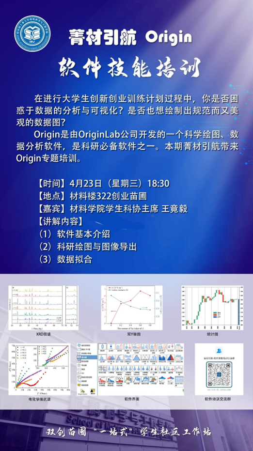 在进行大学生创新创业训练计划的过程中,你是否困惑于数据的分析与可视化?是否也想绘制出规范而又美观的数据图?Origin是由OriginLab公司开发的一个科学绘图、数据分析软件,是科研必备软件之一。试验数据的分析、处理、可视化,绘制符合科研规范的数据图均离不开它。本期菁材引航软件技能培训邀请到博彩app下载 学生科技协会主席王竟毅,带来Origin专题培训,相信你一定有新的收获。