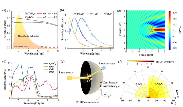 a) GdTaO4与Y3NbO7的光学特性对比;b)不同尺寸GdTaO4颗粒的光学散射行为;c) 双相陶瓷中热辐射散射行为;d) 不同GdTaO4含量双相陶瓷的红外透过率对比;e) 热辐射双向透射测试示意;f) Y3NbO7与双相陶瓷的方向性透射对比